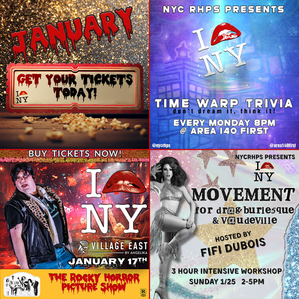 The New York City Rocky Horror Cast performs Every 1st & 3rd Saturday @ Village East Cinema & at venues all over the Big Apple. All shows will be posted here on nycrhps.org and to all of our social media. Purchasing advance tickets for all of our shows is highly recommended, as they are selling out fast! Please check our social media pages (@nycrhps) for the most current updates.